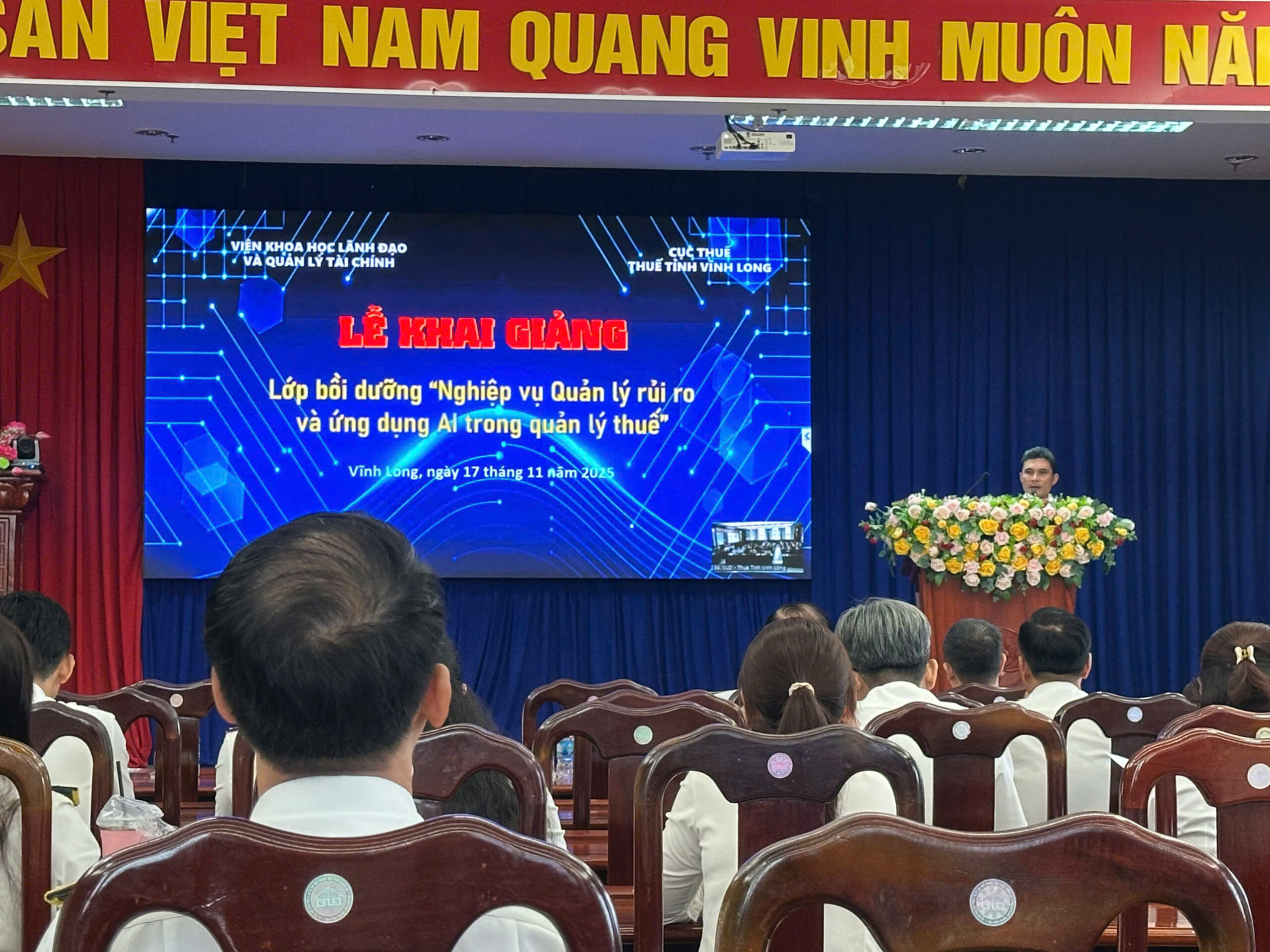 Sáng ngày 17/11/2025, tại Trụ sở Thuế tỉnh Vĩnh Long, Viện Khoa học Lãnh đạo và Quản lý Tài chính phối hợp với Thuế tỉnh tổ chức Lễ Khai giảng Lớp Bồi dưỡng Nghiệp vụ, kỹ năng Quản lý rủi ro và Ứng dụng trí tuệ nhân tạo (AI) trong quản lý thuế dành cho đội ngũ công chức đang thực thi nhiệm vụ trên địa bàn tỉnh. Khóa học diễn ra trong 03 ngày (17–19/11/2025) theo hình thức tập trung tại trụ sở Thuế tỉnh và trực tuyến qua 11 điểm cầu tại Thuế cơ sở, bảo đảm việc học tập được triển khai rộng rãi, đồng bộ và thuận tiện.